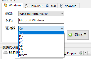 点击”添加新条目“,名称可以随便写,驱动器即为你安装副系统的位置,然后点击”添加条目“。